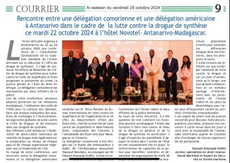 Au cours de cette rencontre, il a été discuté de voir comment les Etats-Unis peuvent accompagner l’Union des Comores à faire face contre le fléau de la drogue en général et de la drogue de synthèse en particulier. Il s’agit d’explorer les possibilités d’appuyer le centre pour l’océan Indien pour mettre en place le renforcement de capacités de la police pour identifier, interdire, et démanteler les organisations de trafic de stupéfiants, et la réflexion sur la fourniture potentielle d’outils pour contrôler les différentes drogues dans nos frontières, dans les aéroports et ports.