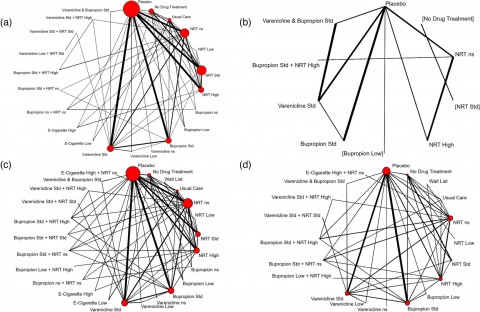 Network meta-analysis of eligible comparisons for sustained abstinence (a), prolonged abstinence (b), any abstinence (c) and 7-day point prevalence abstinence (PPA) (d). Thicker edges in network figures represent comparisons with a higher number of randomized patients, while interventions with a larger number of randomized patients have larger circles. Interventions were excluded if they were disconnected from the main network. Credit: DOI: 10.1111/add.15675