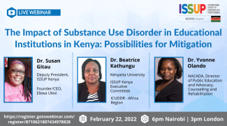 ISSUP Kenya would like to invite you to their next Webinar on The Impact of Substance Use Disorder in Educational Institutions in Kenya.