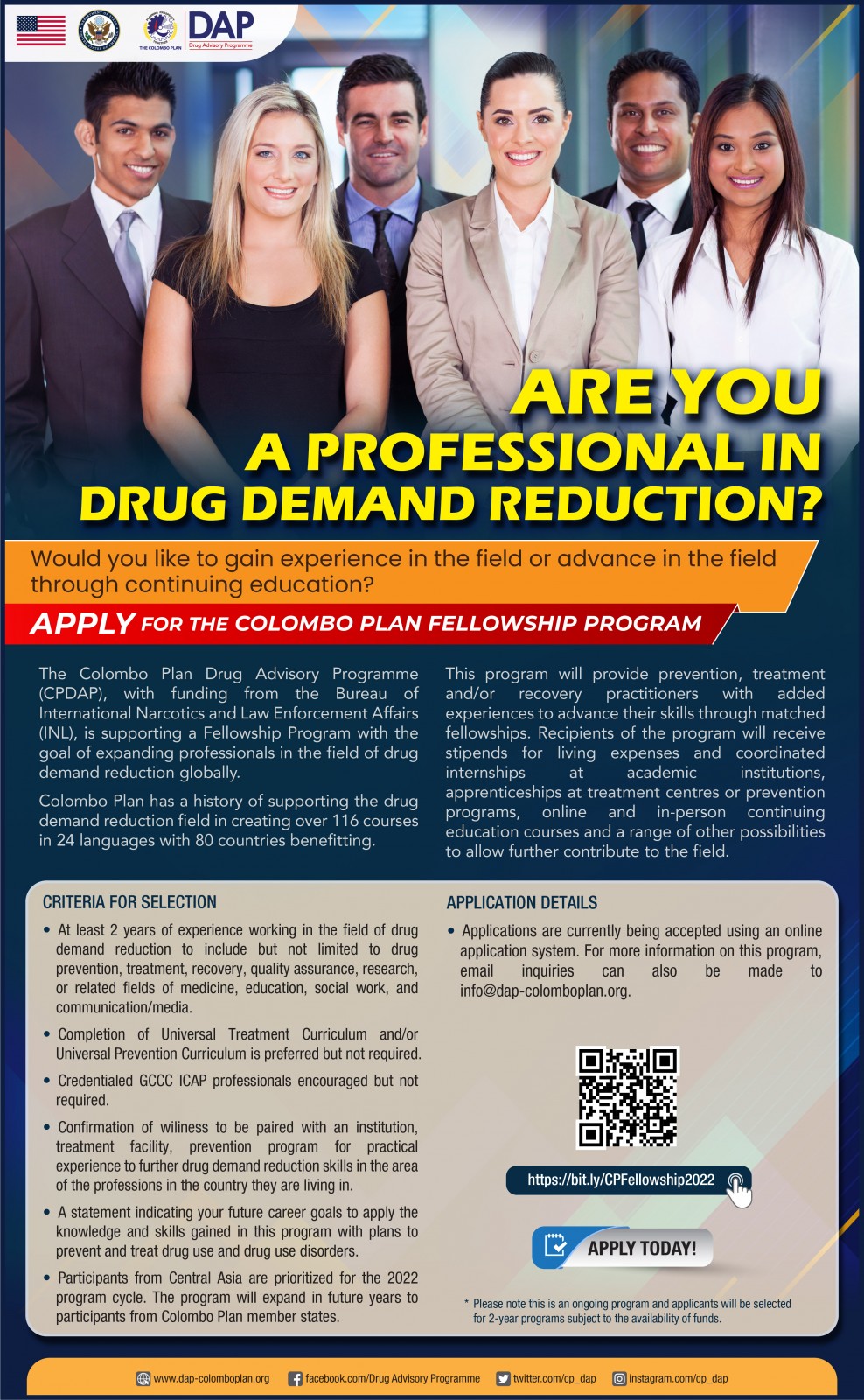 O Programa Consultivo de Drogas do Plano Colombo (CPDAP), com financiamento do Bureau of International Narcóticos e Assuntos de Aplicação da Lei (INL), está apoiando um Programa de Bolsas com o objetivo de expandir os profissionais na área de redução da demanda por drogas globalmente.